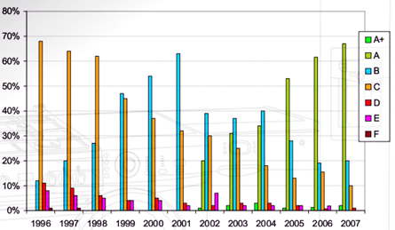 Arçelik için geçerli olan yukarıdaki grafik Türkiye'nin genel eğilimini yansıtmaktadır. Grafiğe bakıldığında A+ sınıfı buzdolaplarının üretimi 2002 yılından itibaren başlamıştır. 2007 yılı itibarıyla en yaygın kullanılan enerji sınıfı A verimlilik seviyesindedir.