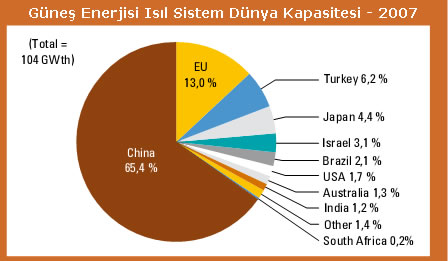 Güneş enerjsiyle sıcak su üreten sistemlerde geçtiğimiz yıllarda olduğu gibi türkiye ilk sıralarda yer almayı başardı. Türkiye Çin ve Avrupa Birliği ülkelerinin ardından üçüncü sırada geliyor.